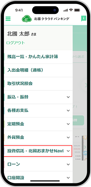 メニューの「投資信託・北國おまかせNavi」をタップし、ご希望のお手続きを選択してください。