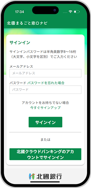 北國まるごと窓口ナビにご登録のメールアドレスとパスワードを入力し、サインインしてください。