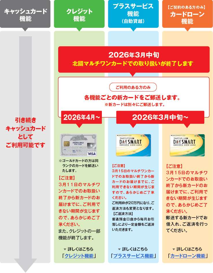 マルチワンカードのお取り扱い終了に伴い、下記のスケジュールにて各機能のご利用を順次停止させていただきます。また、クレジット機能につきましては、株式会社北国クレジットサービスへの会社分割により、同社へ移管されます。